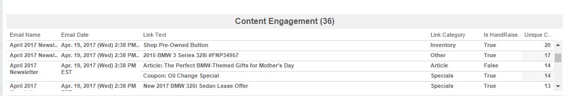 The Content Engagement section will show how each of the hand-raiser links in your communication contributed to the total clicks—look for "True" in the column "Is Handraiser." Clicking on the name of each link will provide the hand-raisers who clicked on this specific link. This allows you to tailor your message to each individual consumer based on their interest.
